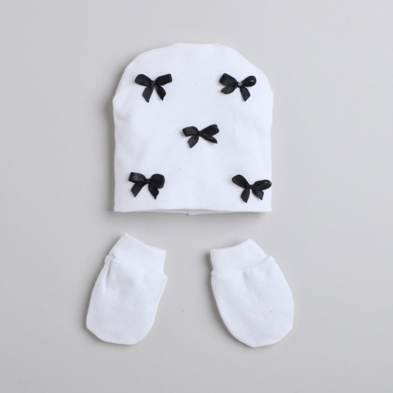 RIBBON BOW EMBELLISHED CAP FOR INFANT WITH MITTENS