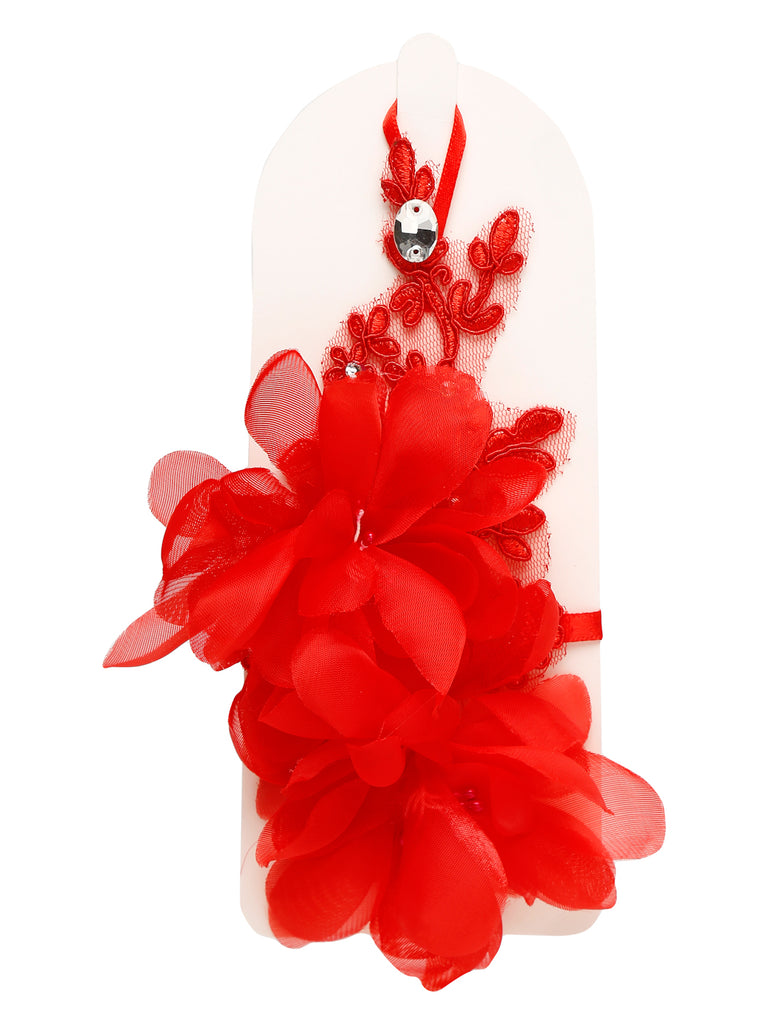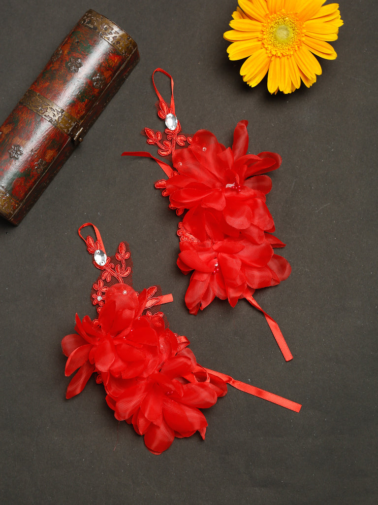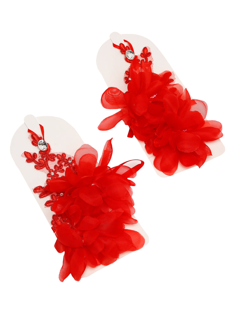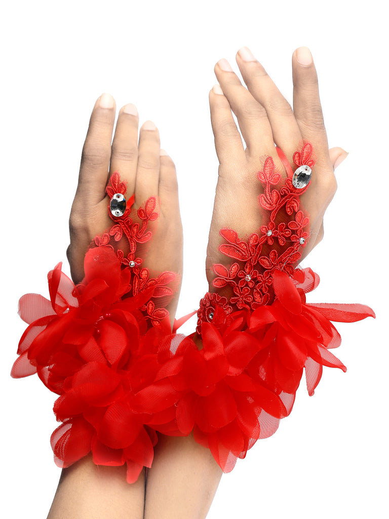 FLOWER GLOVES ARE WRIST LENGTH FINGERLESS GLOVES,MADE OF NYLON WITH STONE EMBELLISHMENT. RIBBON TIE BACK GIVES PROPER FIT. 3D FLOWERS OVER IT IS BEAUTIFUL.