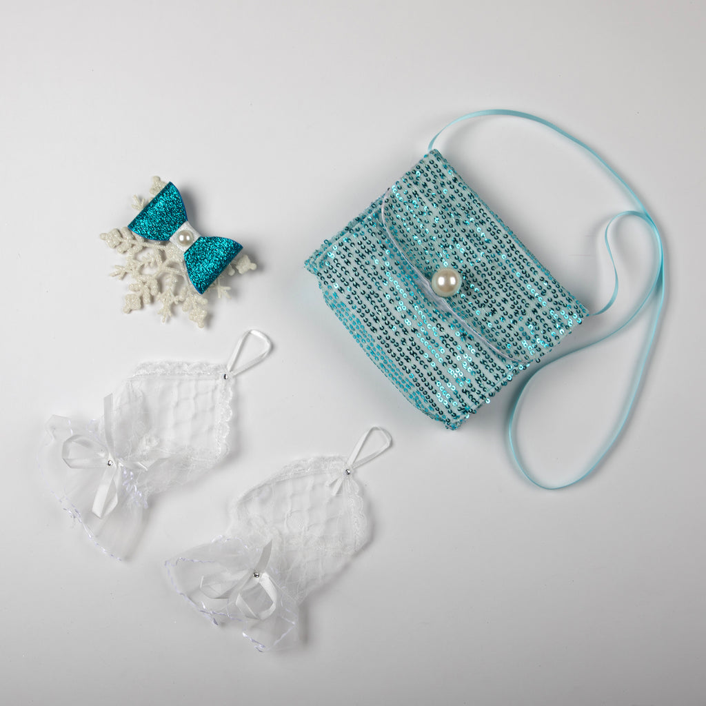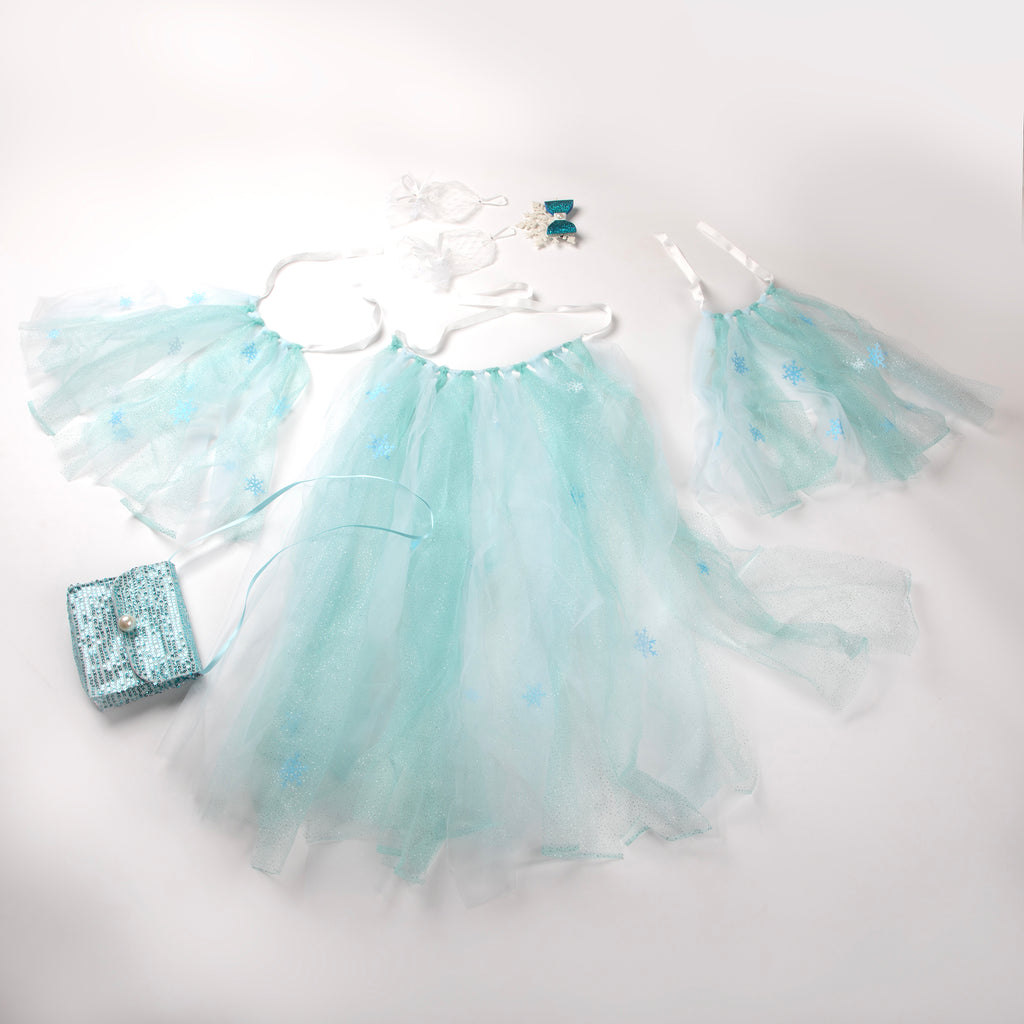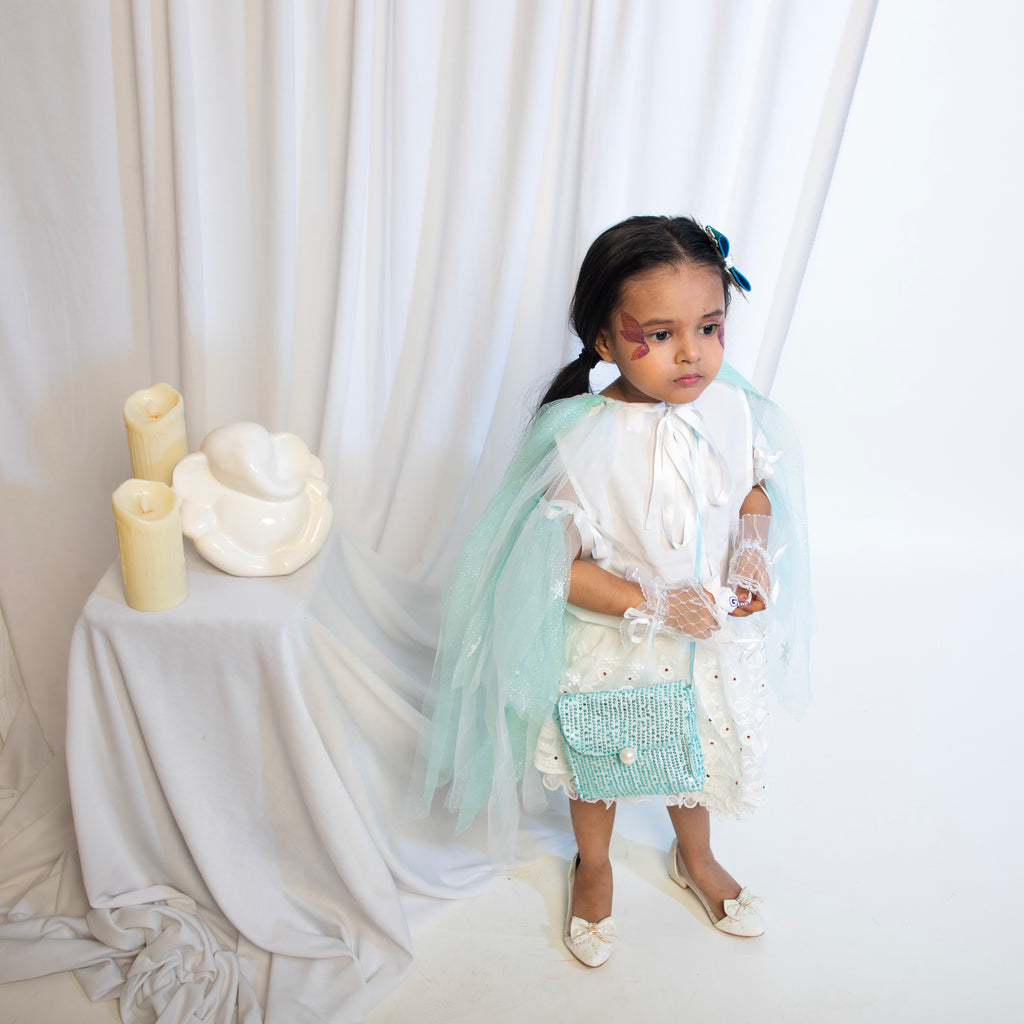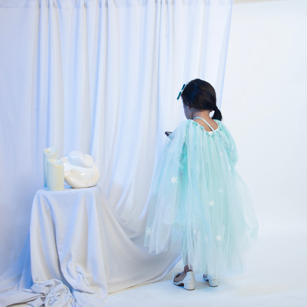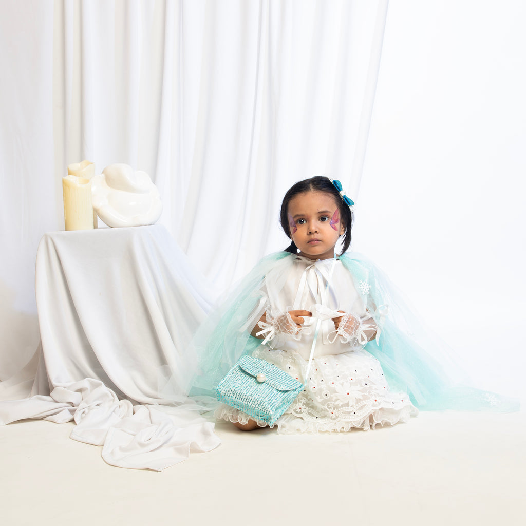 OUR SPARKLY TULLE CAPE SET IS PERFECT TO TRANSFORM YOUR PRINCESS AND GET READY FOR GENRAL ROLE . PLAY OR PARTICIPATE IN THIS HALLOWEEEN. WRAP AROUND STUCTURE FITS ALL PERFECTLY. SET INCLUDES 1. SNOWFLAKES CAPE 2. SLEEVES 3. CLIP 4. PURSE 5.Gloves