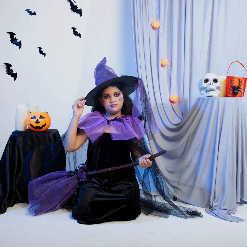 OUR SPARKLE CUM HORROR WITCH SET FOR LITTLE REAL LIFE PRINCESS .SET INCLUDES 1.WITCH CAPE 2. WITCH CAP 3. WITCH BROOM