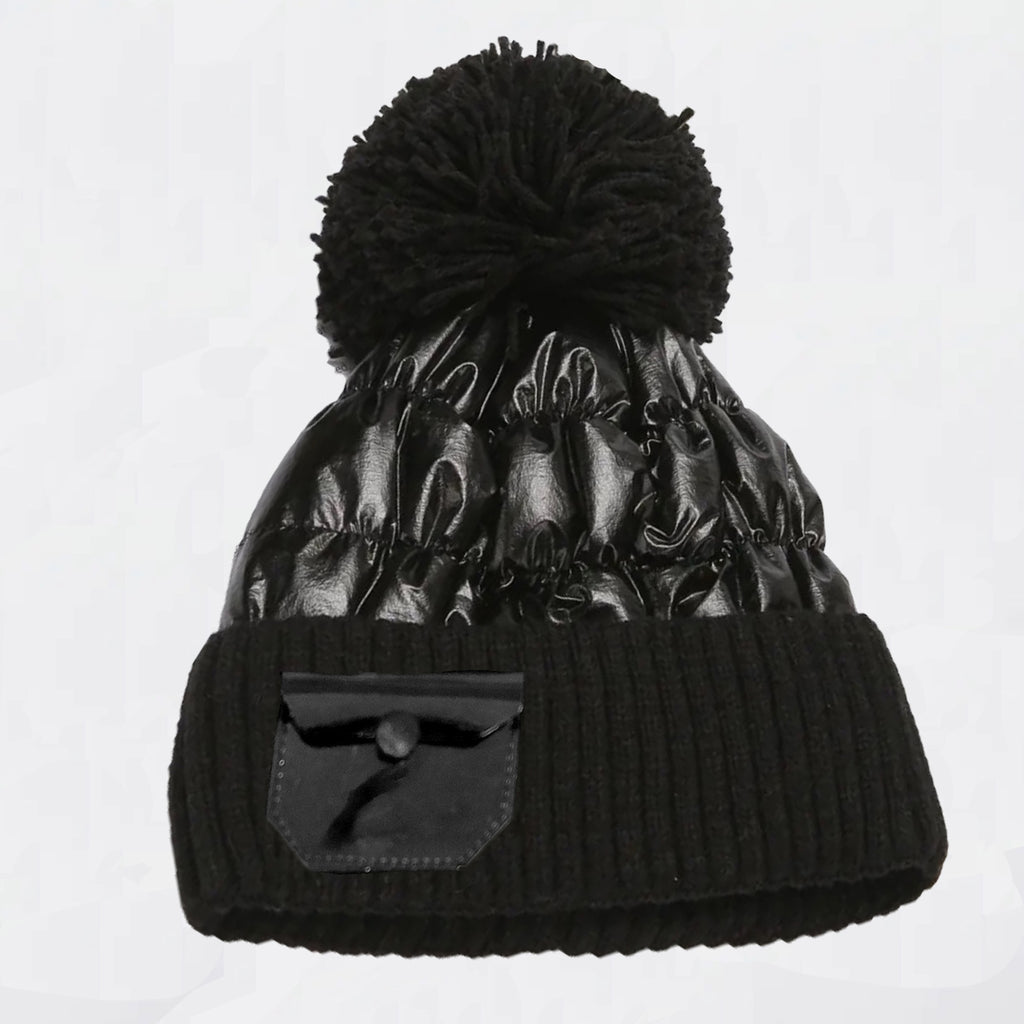 It combines the warmth and comfort of a knitted cap with a shiny metallic finish